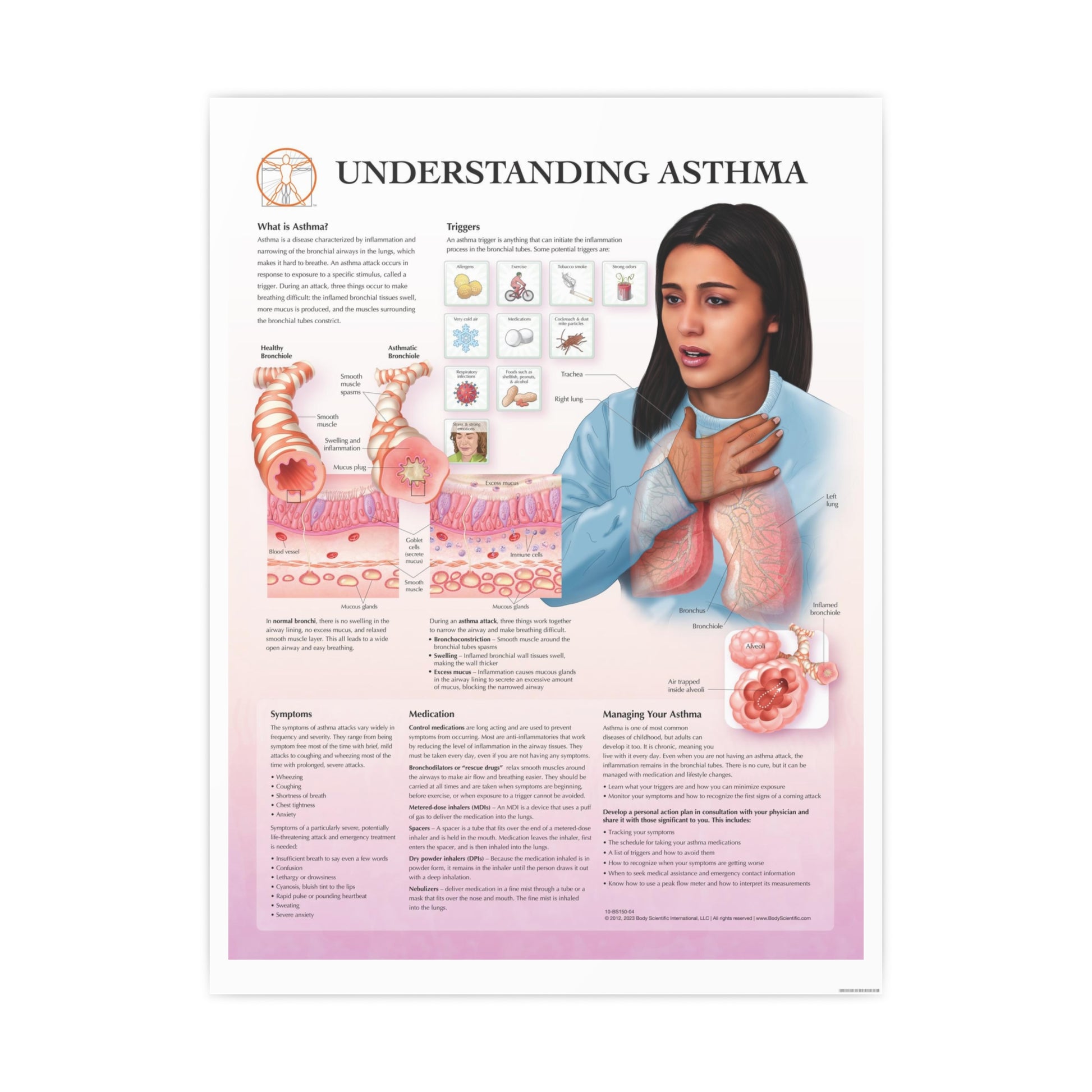 The Understanding Asthma chart explains this chronic respiratory condition through detailed illustrations of healthy and asthmatic bronchial tubes. It identifies common asthma triggers, symptoms, and the physiological changes that occur during an asthma attack. The chart also outlines treatment options such as control medications, inhalers, and nebulizers, along with tips for managing asthma in daily life. Perfect for clinics, classrooms, and patient education, this chart makes it easier to understand and explain asthma care. (BS150-04)